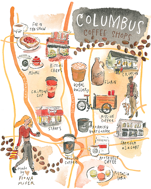 Downtown Granville fold out map and customer loyalty card featuring participating local stores + restaurants. I based the design around the town’s business district branding and color palette, along with the many activities and distinct architectural features of the town. Read more about commissioning a map illustration for your business here.