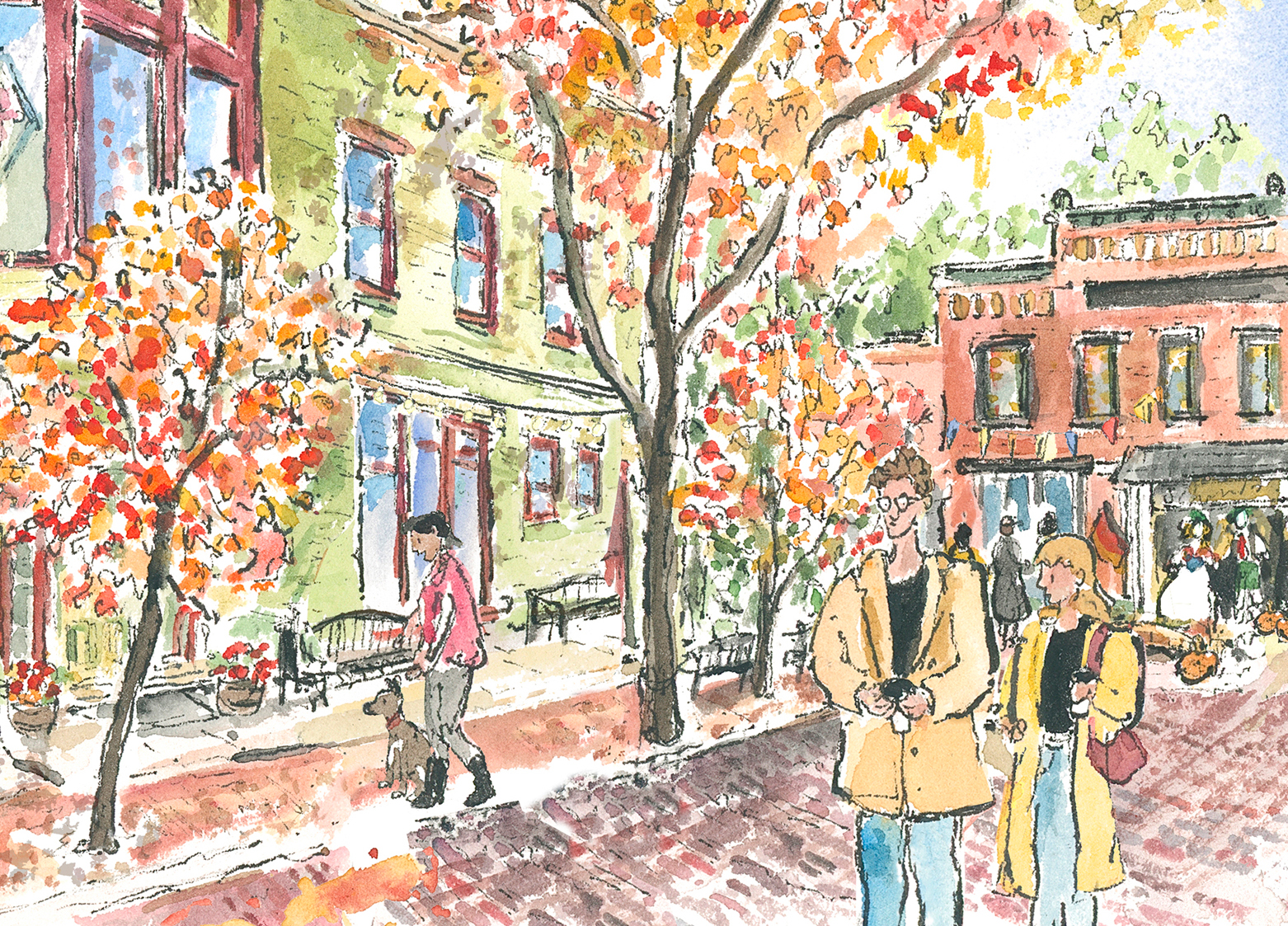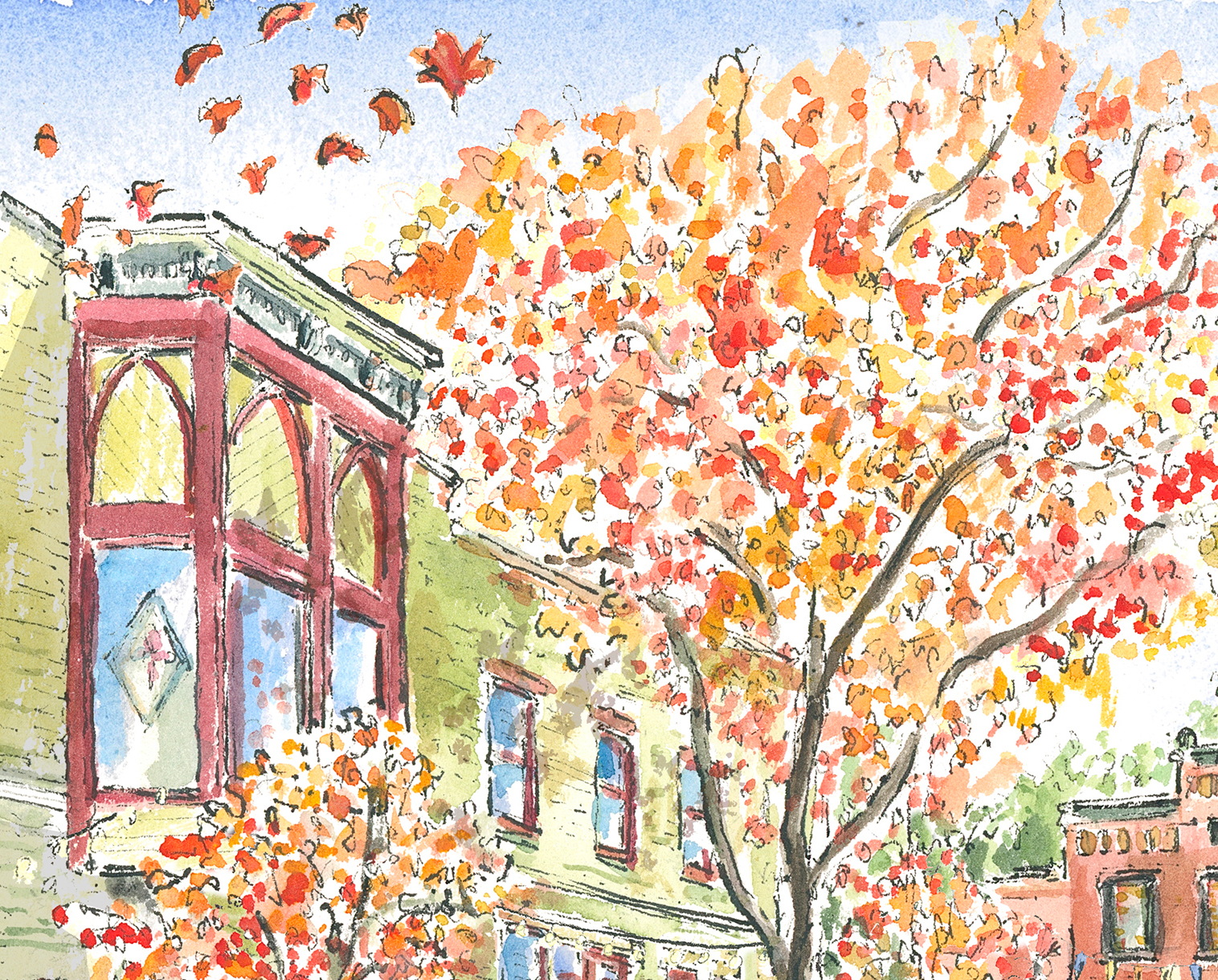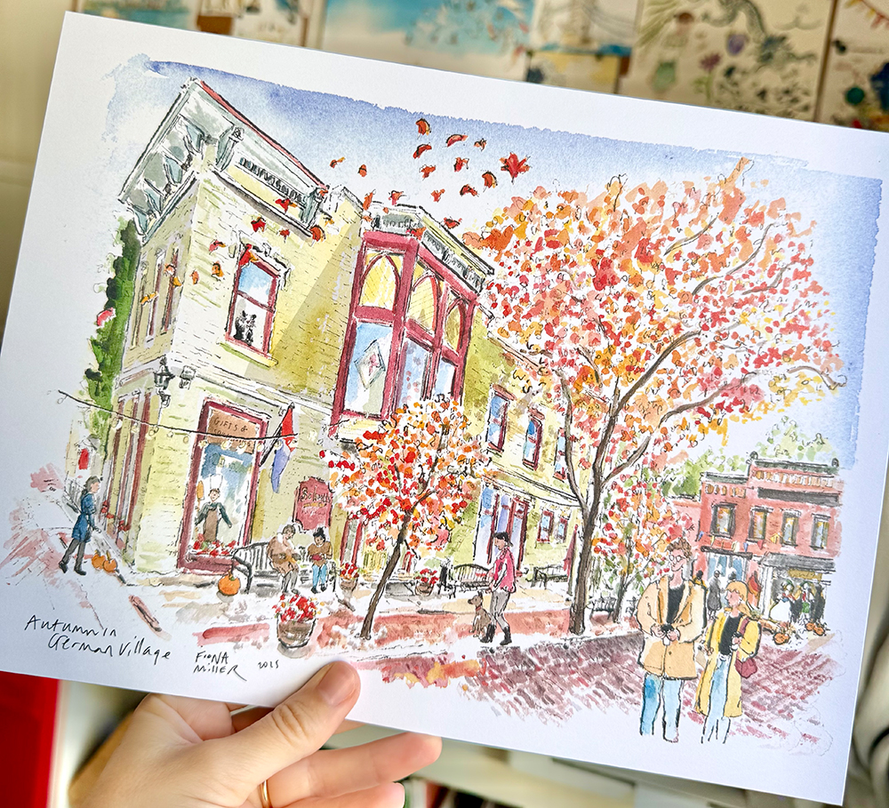 German Village brick work and falling orange leaves: it’s a feast of colour for the eyes. City street scene with a few German Village classics, a whimsical art print from Fiona Miller.
